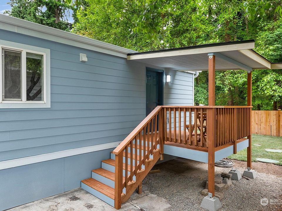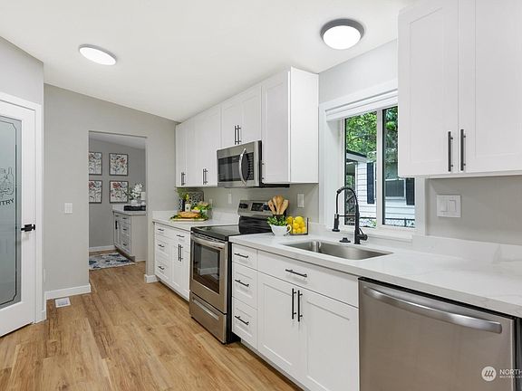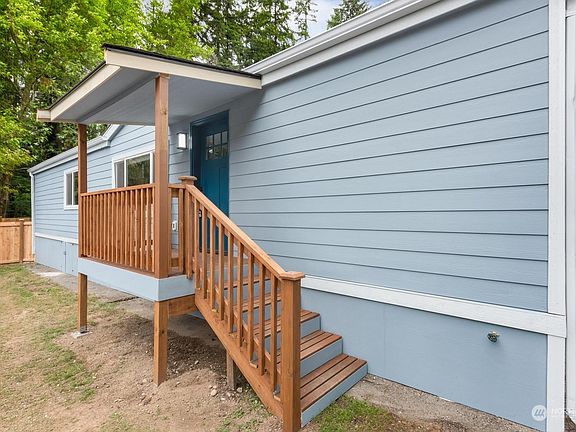 Fully refinished home in this highly desirable area of Bothell, Northshore School District! You own the land and this lot backs up to a greenbelt with secluded walking trails through your own private forest. Enjoy the custom designed kitchen with quartz countertops, all new appliances, extra cabinets and a large walk-in pantry. The primary suite features an additional space for a home office or nursery and a spa like bath with dual vanities and imported tile shower. New septic system, roof and siding installed 2023. This well maintained community offers an on site RV/Boat parking lot and an outdoor pool, clubhouse & sports court just steps away at the end of the street!