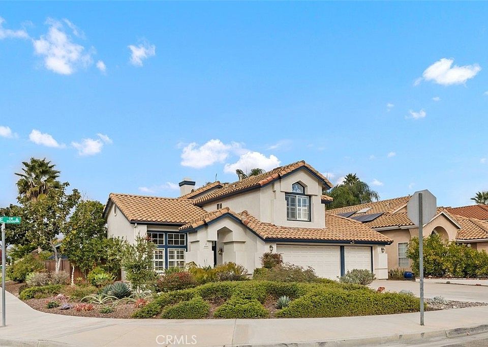 This beautifully maintained Orangecrest home has had the same owners since it was built. This large corner lot has mature, drought-tolerant landscaping in the front yard. As you enter the home, the high ceilings, wood laminate floors, wood and iron stair rails, and custom chandeliers welcome you into this updated home. The living room has plenty of natural light from windows on both walls. Moving into the home, the dining room has updated sliding doors to the back patio. The kitchen has been updated to suit any chef. There is plenty of storage, including pull-out drawers in the pantry cabinets. There is a sitting nook where you can enjoy your morning coffee. The kitchen and family room are seamlessly connected making the rooms perfect for entertaining as you enjoy the company of your guests. The family room boasts a built-in entertainment center next to the fireplace. The fireplace has been accented with custom art deco ceramic tiles, adding a touch of nostalgia to the room. Another unique touch is the hand-blown café lights above the breakfast counter. The downstairs ½ bath has been updated with a custom pedestal sink. Upstairs you’ll find the 4 bedrooms. The main bedroom suite includes a fireplace between the bedroom and the bathroom. It has vaulted ceilings and plenty of natural light. The bathroom has double sinks, a large walk-in shower, and a walk-in closet. Double doors separate the bedroom from the office retreat adjacent to the room. This office could also be the 4th bedroom. Bedrooms 2 & 3 are spacious and bright. Each of them features custom stained glass windows adding charm to the rooms. The hall bath has a lovely glass tile wall behind the sink counter and a custom oversized bathtub shower enclosure. The exterior of this home will not disappoint either. It has an outdoor cooking area off of the main patio off of the family room. This patio and the patio from the dining area have alumawood shade coverings. Across the grass, there is a 3rd patio with a custom-built above-ground spa. This backyard offers a lovely space to enjoy the fabulous California weather. There are multiple fruit trees throughout the property including Tango mandarin oranges (4), seedless Kishu, Bears Lime, Kumquat, and Myer lemon. The home is close to Thundersky Park just a block away and award-winning elementary and middle schools are just around the corner. Overall, the perfect place to call your next home!