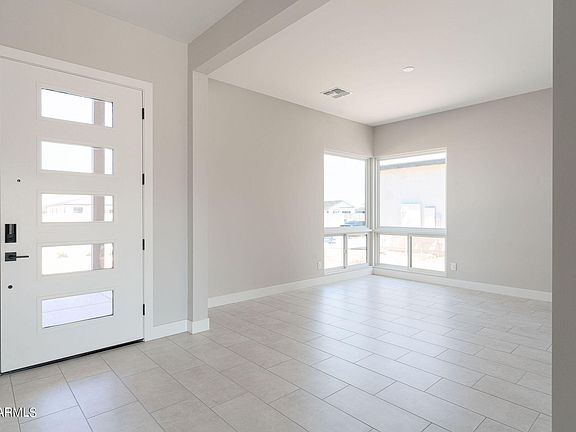 The striking contemporary modern elevation welcomes you with sleek metal posts and a covered front patio. Inside, the Ambrosia floorplan impresses with soaring ceilings and an open layout that maximizes natural light and space. A formal dining area greets you with a charming corner window, creating a bright, airy atmosphere as you enter. The expansive great room features a gas fireplace with a sophisticated tile surround and a Western 90-degree multi-sliding glass door system, seamlessly blending indoor and outdoor living while flooding the home with light.