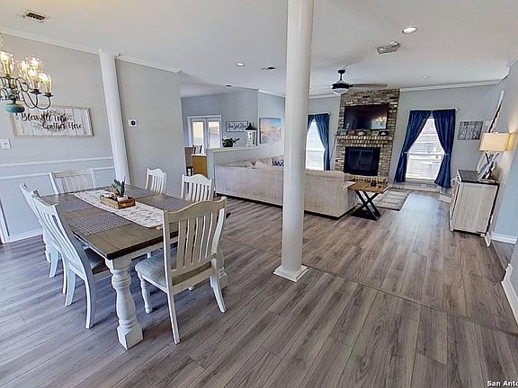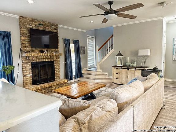 Welcome to this custom Stone Oak home on an oversized private corner lot, designed with both style and comfort in mind. Enjoy incredible outdoor living with a pergola, multiple decks, and a balcony - perfect for hosting friends and family! Step inside to discover a home loaded with upgrades: plank flooring, quartz countertops, custom cabinets, painted brick accents, a trendy backsplash, and a wine bar. The open-concept family room features a cozy wood-burning fireplace, creating a warm and inviting atmosphere. The spacious master suite downstairs includes a sitting area, dual closets, a jetted tub, and a double vanity. Upstairs, you'll find three large bedrooms, a game room, a dedicated office, a second-floor laundry room, and a huge walk-in attic. This home is packed with energy-efficient features including solar panels, climatized windows, radiant barrier, reverse osmosis system, LED lighting, and a recirculating hot water heater. Plus, enjoy peace of mind with a new HVAC system installed in 2023. Skip the hassle of a private pool - the neighborhood pool, park, and playground are just steps across the street!