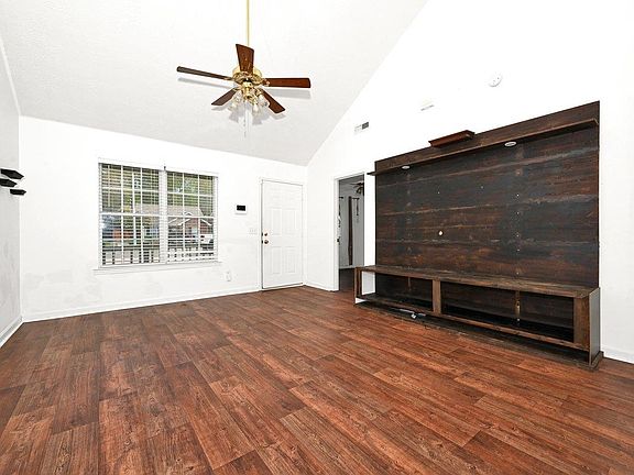 Perfect starter, down size or investment home. Easy up keep with Vinyl wood flooring throughout. Open floor plan with vaulted ceiling in living room & wood accent wall feature. Kitchen bar for seating. No steps in for easy access. 2 bedrooms split by large bath and laundry. French doors lead out to side patio and privacy fenced backyard with storage building. Pull down stairs with floored storage area. Convenient location to shopping, grocery and entertainment.