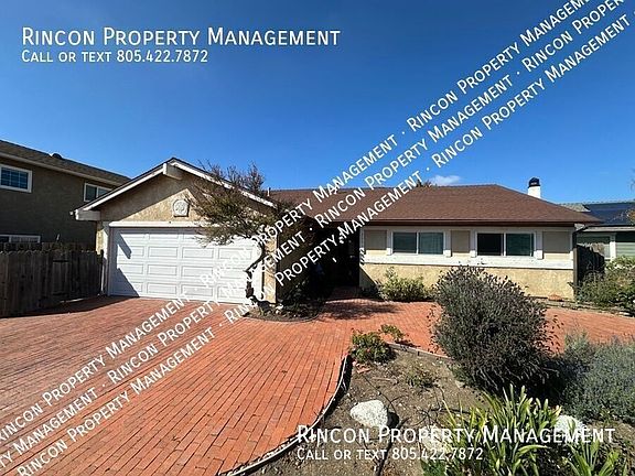 Available starting November 1st, this well-maintained 3-bedroom, 2-bath home in Ventura offers 1,461 square feet of comfortable living space and a large private yard. A brick driveway leads to the covered entry and just inside, the formal living area features a fireplace and picture windows that fill the space with natural light. The dining area connects seamlessly to the kitchen, which comes equipped with a stove/oven, dishwasher, refrigerator, and microwave. Dark cabinetry pairs beautifully with rich marble countertops for a sophisticated finish. The hallway provides ample built-in storage, and the primary bedroom includes an attached bath with a large vanity and a walk-in tile shower with built-in seating. Two additional guest bedrooms share a second full bath, also featuring a walk-in tiled shower and spacious vanity. A bonus room, located just a few steps above the main living area, offers flexibility for use as a home office, den, or guest space. The laundry area is situated in the two-car garage, with washer and dryer included. Step outside to a fenced backyard featuring an extended patio, part of which is covered by a pergola, ideal for outdoor relaxation or entertaining. The yard also has fruit trees including avocado, apple, and persimmon. Conveniently located within three miles of restaurants and grocery stores and just a short drive to both Highway 101 and 126, this home offers an excellent blend of comfort and accessibility. To apply, get more information or schedule a showing, contact us at 805, then 422, then 7872. Dial "0" when you reach the recording to be transferred to a live agent. Please note: the home is not furnished; furnishings shown in photos are not included. Showings are by appointment only.