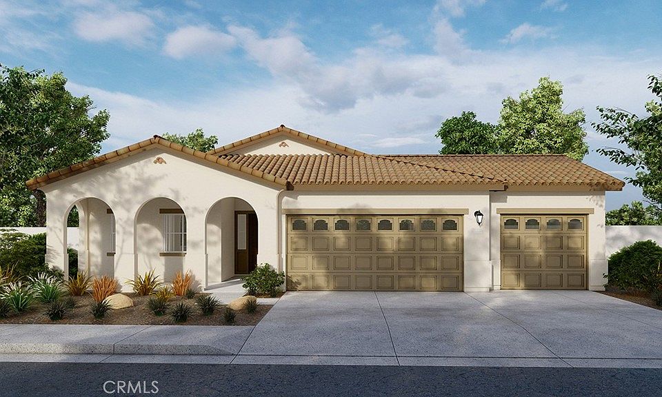 New Construction - This spacious 1,898 square foot [single story] [4] bedroom [3] bath home with a California Spanish inspired façade located on a cul-de-sac. With a wide entry that leads to the open concept Great room with vaulted ceiling, Dining area with slider leading to the back yard, a kitchen island with breakfast bar, Bianco Tiza Quartz counter tops, stainless steel appliances, and a pantry space. All four bedrooms are generously sized, the ensuite has a large walk-in closet, and the laundry room is conveniently located just off the main hallway. The home has crisp white shaker-style cabinetry and designer vinyl and carpet throughout. This truly modern home has all the Smart Home features you would expect, including a direct-access [3]-car garage pre-plumbed for an electric car! This homesite is fully landscaped and irrigated. The community has easy access to nearby shopping, dining, entertainment, highways and freeway. This home is ready to move in by December 2025 and Solar is Included in the Price of This Home !!