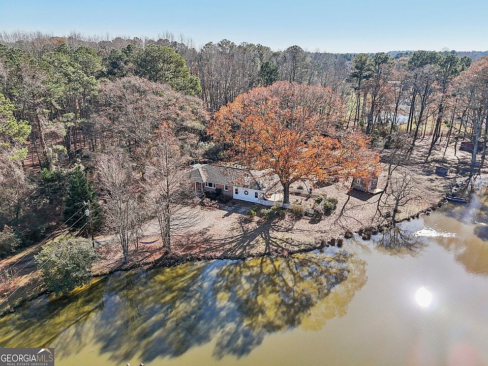 If you are looking for a great home on private acreage with a private pond, then look no further! This cozy home boasts of a renovated kitchen. Laminate and hardwood floors. Quartz countertops. Tons of cabinet space and a pantry. Brand new windows throughout (warranty included). New architectural shingle roof. Oversized den great for family time and hosting guests. Potential for 4th bedroom...or office/flex space...or a master suite with large walk-in closet. Separate laundry room and also a sun room. Plenty of space outdoors for your garden or homestead dreams. Property contains an almost 2-acre pond with fish (and often ducks or geese). Garden area. Barn, shed, and chicken coop. There is also a finished outbuilding with electricity, great for guests or extra office space. Property is fenced. Location is superb: quiet, rural area, surrounded by beautiful horse farms and acreage. Yet, convenient to multiple cities and I-20. Black Shoals Park is right around the corner and Costley Mill Park is very close. No HOA! Come see this beautiful property haven for yourself.