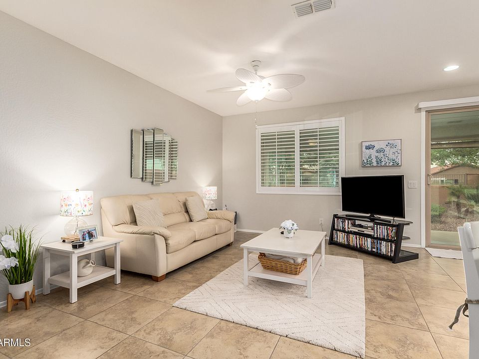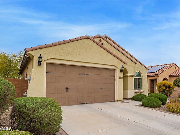 Beautiful move-in ready home backing to a greenbelt! This METICULOUSLY MAINTAINED home features a desirable split-bedroom floor plan with an open kitchen and great room. The kitchen is beautifully appointed with granite counters, stainless appliances, a gas range, reverse osmosis (2024), & roll-out shelving. Enjoy the elegance of plantation shutters and new LVP flooring (2023), HVAC (2023). The extended covered patio, pavers, and professionally landscaped backyard create an ideal setting for entertaining. Additional highlights include additional garage storage, extra insulation, and water softener (2024). Conveniently located within walking distance to elementary and middle schools. Festival Foothills offers amazing community events! Solar lease provides more electricity than owners use.