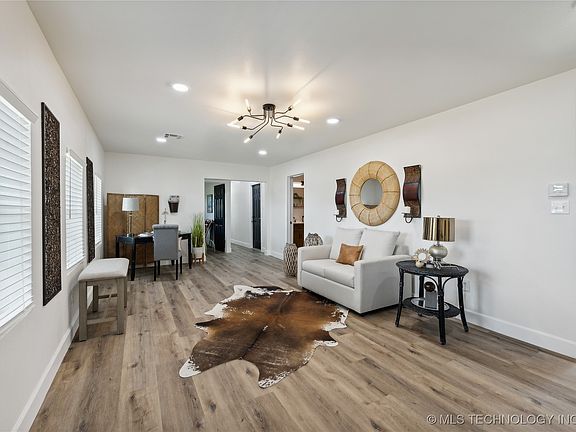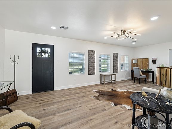 Beautiful country updated home sitting on 4.76 acres of land with large pond and spacious front porch. Located on freshly paved road just 3 miles west of Will Rogers Downs. Easy access to Prior, Claremore, and Tulsa. All stainless steel appliances stay, new cabinets in kitchen have soft close drawers and gorgeous porcelain countertops with 10 foot island. Luxury vinyl plank with under padding for extra comfort throughout. Large tiled fireplace with electric insert in den/dining area. Gorgeous soaking tub in main bath perfect for relaxing after a hard days work. Schedule your showing today to see this ranch style oasis. Seller offering 1 year home warranty. Owner/Agent