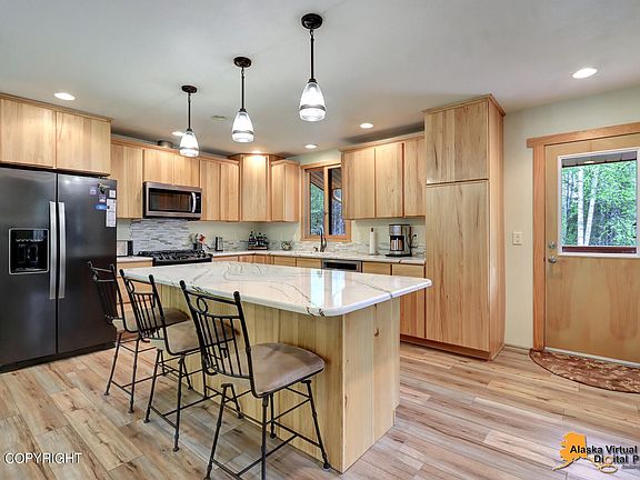 Immaculate private Chugiak home with ample space for all your needs. Features include: hickory kitchen cabinets, quartz counters, LVP flooring, Anderson windows, live edge window sills in the great room, Allen & Roth blackout shades, knotty pine doors, double headed shower in master, shed space, concrete parking pad, decks galore, large secluded 2.5 acre parcel AND hot tub that works and stays!