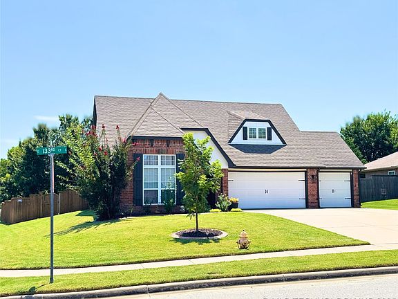 Discover your home in popular Providence Hills! Located just a block from the pool and within walking distance to splash pads, trails, and community spaces! This beautifully upgraded corner-lot gem features fresh exterior paint, epoxied garage floors, mature trees, a covered pergola with extra patio, and a spacious backyard perfect for everyday living or entertaining. Features: Large Corner Lot, 3 Car Garage, Upstairs Flex Space, Office/Formal Dining, Sprinkler System, Block From Pool, Splash Pad, and Playground, Highly Sought-After Bixby West Schools.