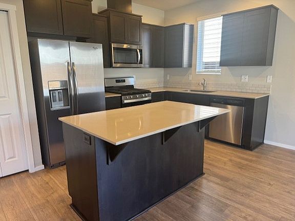 4 bedrooms, 2.5 bathrooms. 1659 sq ft. Laminate flooring through out the downstairs, carpet upstairs. Solid surface counter tops in the kitchen with stainless appliances. Fenced in backyard. Two car garage. Air Conditioning. Washer/Dryer provided