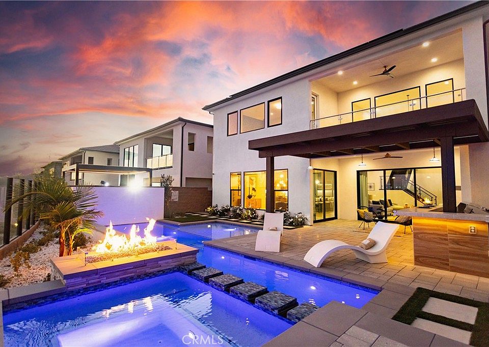 Are you ready to experience unparalleled luxury living with over $800K in custom upgrades and sweeping panoramic views? Welcome to this exceptional 5-bedroom, 5.5-bathroom estate in the highly coveted Hillcrest Collection, a 24-hour guard-gated community in the heart of Porter Ranch. Perfectly positioned on a premium cul-de-sac lot, this home is designed for those who seek an elevated lifestyle, blending modern elegance w/ comfort. As you step through the front door into the impressive two-story foyer, you're greeted by a soaring great room and spacious dining area that flows effortlessly into the stunning outdoor living space. The heart of the home is the chef’s dream kitchen, complete w/ a large center quartz waterfall edge island, custom backsplash, floor-to-ceiling cabinetry, Wolf appliances, & a built-in 48" Sub Zero fridge. This space is perfect for hosting guests year-round, whether indoors or by opening the stackable sliding doors to the expansive outdoor area w/ its covered patio, sparkling pool & spa, fire-pit, & outdoor kitchen equipped w/ a built-in gas BBQ. Upstairs, the luxurious primary suite is a true retreat, featuring a private deck with incredible city views, an expansive walk-in closet, and a spa-like bathroom w/ dual vanities, a soaking tub, a luxe shower, & a private water closet. The second floor also offers a generous loft space overlooking the great room, perfect for relaxation or a home office, as well as secondary bedrooms, each with ample closets. Two of the upstairs bedrooms have en-suite bathrooms, providing comfort and privacy for family or guests. For added convenience, this home features a first-floor bedroom with its own private bath, ideal for guests or multi-generational living. The movie lover will appreciate the custom home theater, complete with a 7.1.2 Dolby Atmos-enabled sound system, a 100-inch LG 4K projector, and a premium Marantz home theater receiver. Over $40K has been invested in automatic shades & drapes throughout, adding sophistication & ease to daily living. Additional upgrades include custom interior doors, hardwood stairs w/ stain finish, upgraded flooring, owned solar system, a Tesla charger, & epoxy-coated garage floors. The two-tone interior paint & premium finishes throughout the home reflect attention to detail. Located next to the top-rated K-8 PRCS school & close to Sierra Canyon School, The Vineyards shopping center , hiking trails, & parks, this home offers not only luxury but also convenience.