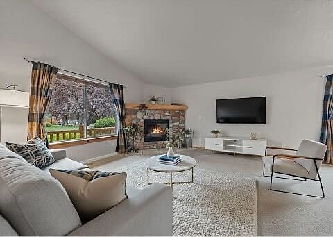 Cozy gas fireplaceFresh exterior paintCentral air conditioningBrand new carpetVaulted ceilingsOpen concept layoutCorner lot