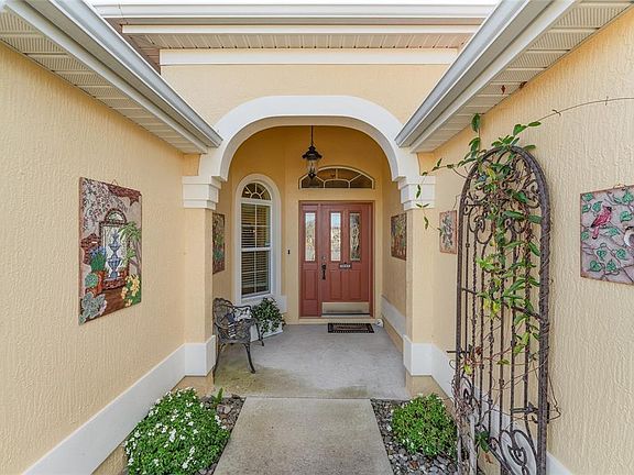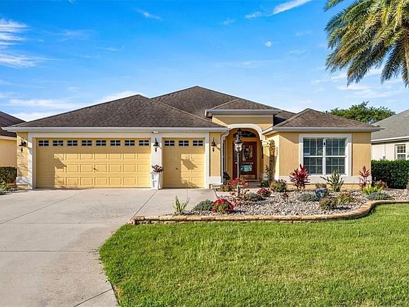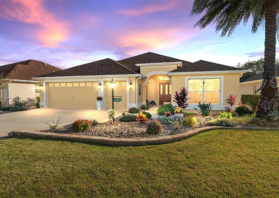 BRIGHT, SUNNY AND READY FOR QUICK CLOSE! This former MODEL HOME with GREAT FEATURES & UPGRADES is ideally located in the Village of Buttonwood, between Lake Sumter Landing and Brownwood Paddock Square. The BEGONIA model is BLOCK & STUCCO construction with a NEW ROOF installed in 2025. The UPGRADED KITCHEN offers tile floors, granite countertops, upgraded white cabinetry, roll out shelves, white appliances and a breakfast nook with chair rail outfitted with table and chairs. Wall art and the decorative items above the upper cabinets can remain with the home. The kitchen is open to the dining and living areas, offering ease in entertaining or every day living. These areas have LVP Flooring, HIGH CEILINGS, plenty of natural light and access to GLASS ENCLOSED LANAI. The DINING ROOM is furnished with an EXTENDABLE DINING TABLE, 8 CHAIRS and DOUBLE LIGHTED HUTCH. The LIVING ROOM will include WALL UNIT, TELEVISION and tables. (Sofas do not convey). The SPLIT BEDROOM PLAN has the GUEST WING at the front of the home. It includes two bedrooms with CEILING FANS. The front guest room is PARTIALLY FURNISHED with END TABLES, COFFEE TABLE, TELEVISION & SECRETARY CABINET, while the second guest room is furnished with QUEEN BED, LINENS and NIGHT STANDS. A POCKET DOOR offers added privacy to this area. The PRIMARY SUITE with ceiling fan, includes DOUBLE WALK IN CLOSETS and EN SUITE BATH with DOUBLE SINKS and WALK IN SHOWER. All furnishigs in the primary bedroom are being removed before closing and room is conveyed empty. The GLASS ENCLOSED LANAI has two ceiling fans, solar shades, insulated ceiling, tile floors, partial furnishings and offers great additional living space and access to the back yard and grill area. INSIDE LAUNDRY has upgraded washer & dryer, deep sink, storage and offers access to the TWO CAR PLUS GOLF CART GARAGE with EPOXY FLOOR, PULL DOWN ATTIC ACCESS, WHOLE HOUSE NOVA WALTER FILTRATION SYSTEM and FREESTANDING SHELVING. Located very near many grocery, dining, shopping, banking and medical options at Lake Sumter Landing, on CR 466A corridor and at Brownwood Square. Enjoy free entertainment (weather permitting) nightly at Lake Sumter Landing and Brownwood Square! From this home, you can easily access both of these squares and many rec centers, pools golf courses and other activities by golf cart!