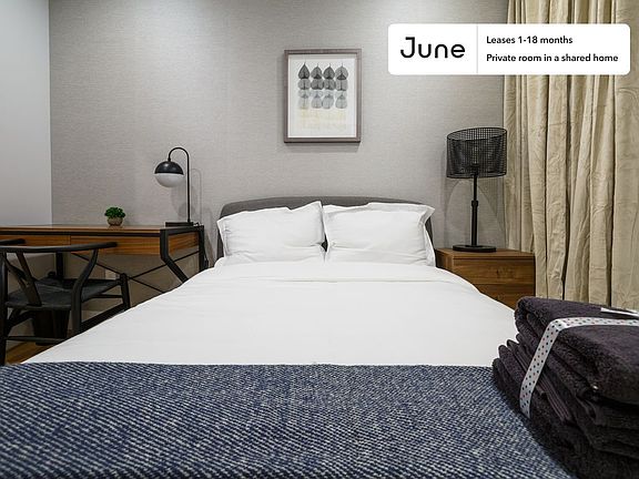 This Queen room in Central Park is available on a 12 month lease or a flexible short term (31 to 364 days) lease. You pick your custom start and end date. Monthly rent rate is determined by furnishing preference, move-in date and move-out date. Speak to a June representative for recommendations on the best stay duration for the lowest rate.