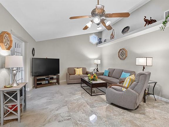 WONDERFUL 2/2 FEATURES A WIDE-OPEN FLOORPLAN. IMPACT WINDOWS & DOORS. BEVELED GLASS ENTRY DOOR OPENS TO GORGEOUS 24" PORCELIAN TILE FLOORING. HUGE LA BOASTS SOARING KNOCKDOWN FINISHED CEILING-PERFECT FOR MOVIE NIGHT. BIG DINING AREA W/ PASS THRU IS GREAT FOR FAMILY GATHERINGS. RELAX W/ FRIENDS IN THE FR/OFFICE. ENTERTAINING IS A BREEZE IN YOUR KITCHEN W/ 30" CABINETS, QUARTZ COUNTERS, S/S APPLIANCES & DEKTON SINK! FALL IN LOVE IN THE OVERSIZED PRIMARY SUITE W/ TONS OF NATURAL LIGHT & HUGE CLOSET - GREAT FOR FASHION FANS! PRIMARY BATH HAS A SHOWER W/TUB tiled to the ceiling! COUNTER HEIGHT VANITY W/ CORIAN COUNTER & UNDERMOUNT SINK. LARGE GUEST BR HAS A WALL CLOSET. GUEST BATH IS NEW W/ PEBBLE FLOORS & FRAMELESS SHOWER! BONUS SUN ROOM OPENS TO PATIO! 1CG! LOW HOA! AMENITIES GALORE! 55+