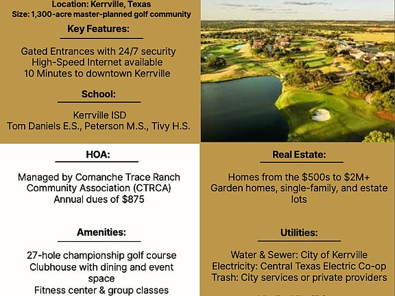 ASK ABOUT OUR CLOSING COST INCENTIVES! Welcome to Comanche Trace, a premier 27-hole championship golf community where luxury meets lifestyle. Estimated for completion in January, this stunning one-story home features 4 spacious bedrooms, 3 bathrooms, and a dedicated Golf Cart Garage, perfect for golf enthusiasts. Step inside and discover an open-concept design with high ceilings, upscale finishes, and generous living areas designed for both comfort and entertaining. Tucked in the heart of Comanche Trace, you will enjoy access to a private Guadalupe River park, a stocked fishing lake, scenic walking trails, a community garden, and more. Optional golf and social memberships unlock even more ways to connect and enjoy resort-style living. Located just minutes from downtown Kerrville, this home blends tranquility, convenience, and modern Hill Country elegance. Do not miss the chance to make 2053 Toscano Way your own. Schedule your tour today and experience a lifestyle where every day feels like a getaway.