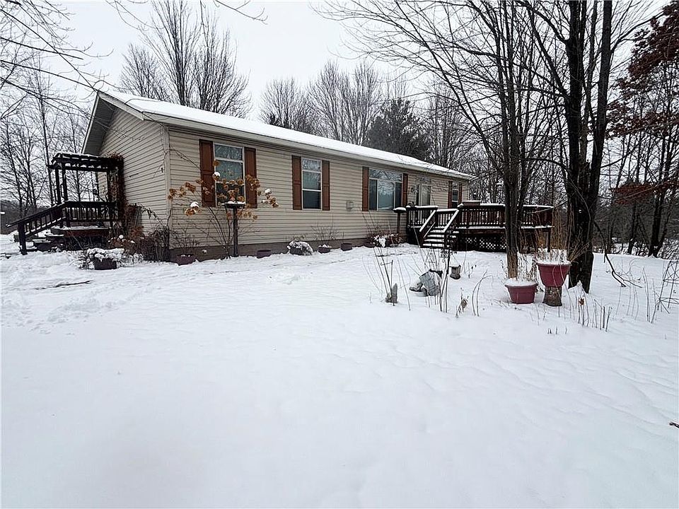 Welcome to this inviting 3 bedroom, 2 bathroom home nestled on a spacious .72 acre wooded lot. Conveniently located near Hwy SS, you will enjoy easy access to both Rice Lake and Cameron. Step inside to an open concept main level that flows effortlessly, perfect for everyday living and entertaining. The primary suite offers a private retreat with a generous ensuite featuring a walk-in shower and relaxing jacuzzi soaker tub. Gather in the large living room around the cozy fireplace, or take in the peaceful setting from either the front or back deck. A detached 2-car garage provides ample space for vehicles and storage. Recent updates bring peace of mind with a new roof on both the home and garage (2023), along with stylish new LVP flooring throughout. This home blends comfort, convenience, and natural beauty! Ready for you to move in and enjoy!