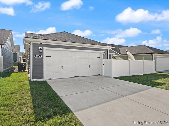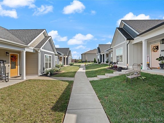 This charming 3 bedroom, 2 bathroom Cottage Home offers convenient one level living in a desirable 'patio' style neighborhood. The open floor plan features luxury vinyl plank flooring throughout, a stylish kitchen with white cabinetry, granite countertops, and thoughtful updates that make this home move-in ready. Over the past three years, the seller has added numerous upgrades including soft-close drawers and cabinets throughout, additional cabinetry above the washer and dryer, an open pantry with custom wood shelving, a custom tile shower with built-in seats and a rain shower head, and shiplap accents in the dining room. The primary suite features a striking accent wall and custom closets, while the primary bathroom offers its own shiplap detail. A two car attached garage with rear entry includes custom shelving that will remain with the home. Outside, enjoy a private fenced yard with a patio ideal for entertaining or grilling, while an attic with storage space adds extra convenience. Perfectly located just minutes from Hwy 62, schools, shopping, and restaurants in the heart of Charlestown, this Cottage Home combines modern updates with everyday charm. Not only is it priced to sell, but it also qualifies for 100% USDA financing! Sq ft & rm sz approx.