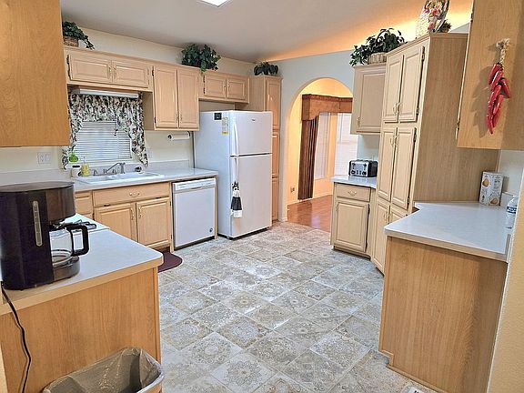 2 bedrooms, 2 bath. This well maintained partially furnished home is situated on a corner lot and has 2 storage sheds. Recent 2025 upgrades include a new stove, dishwasher, garbage disposal and water heater. HVAC new in 2024. Desirable split bedroom floor plan with an open concept living kitchen/living/dining are enhanced by skylights, ceiling fans. Laminate and tile flooring throughout. Guest bedroom has a seperate AC split system. The finished AZ Room is perfect for entertaining, crafting, or sewing. Plus a covered patio and grill.