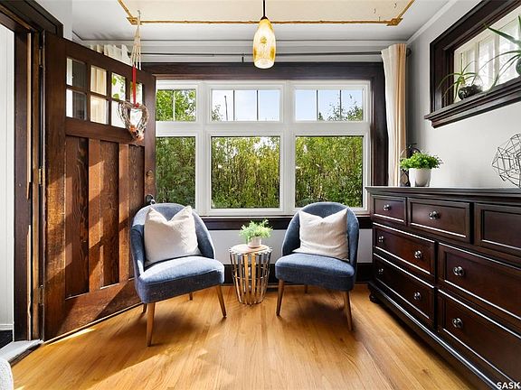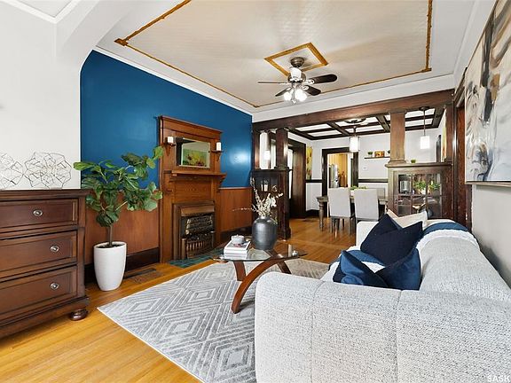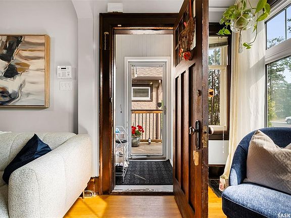 Welcome to 2054 Pasqua Street, a charming 1 ½ storey home located in the heart of Cathedral. This 887 sq ft character home, built in 1922, offers a perfect blend of original charm and modern updates. Step inside to a bright and spacious living room featuring refinished original hardwood floors, beautiful woodwork, a new glass window in the original frame, and a striking antique (non-functional) fireplace with built-in bookshelves. The formal dining room boasts a trayed ceiling and a cozy bay window. The updated kitchen offers maple cabinetry, while the main floor 4-piece bathroom features newer fixtures, a modern vanity, and ceramic tile. Two good-sized bedrooms complete the main floor, one currently used as a home office. Upstairs, you’ll find a private master retreat with bamboo flooring, newer windows, spray foam insulation, and a 3-piece ensuite bathroom. The finished basement offers a comfortable family room, cold storage, and a high-efficiency furnace. Enjoy the private backyard oasis with a fire pit area, pergola included, and a new deck built in 2022, perfect for relaxing or entertaining. A single detached garage (used as a shed) plus additional parking complete the exterior. Major upgrades include new shingles in 2024, PVC windows in 2022, new back door in 2020, front step in 2022, refinished hardwoods in 2019, new basement flooring, and updated wiring. Located steps from parks, schools, and Cathedral’s unique shops and restaurants, this home is move-in ready and full of character.