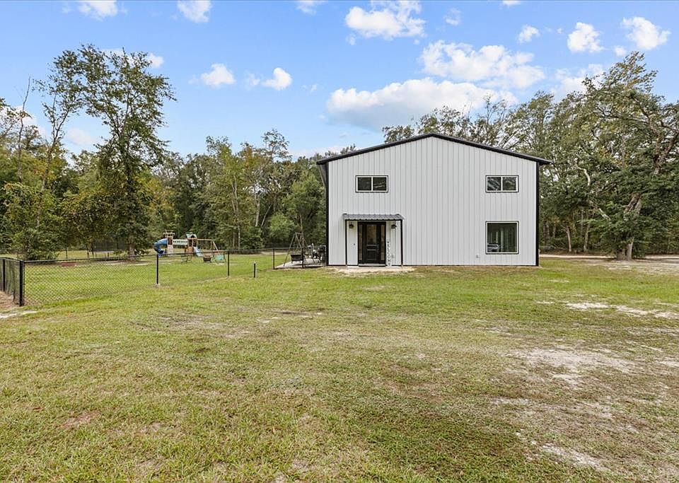 Set on 5 acres in Lake City, this spacious 6-bedroom, 4-bathroom barndominium offers a flexible layout with room to grow, gather, and enjoy the outdoors. As you step inside, you're met with an open floor plan centered around an electric fireplace that creates a natural focal point in the main living space. Exposed brick accents and butcher block counters add character and function, while the layout is designed to support both everyday life and entertaining. The primary bedroom is located downstairs for added privacy, while additional bedrooms and a bonus living area upstairs offer options for guests, office space, or a playroom. A large laundry room doubles as a mudroom, providing practical storage and entry space. Step outside to a covered patio that invites quiet mornings or evenings with family and friends. Lake City offers a balance of rural space and access to daily conveniences. Outdoor enthusiasts will appreciate nearby Alligator Lake Park, known for its walking trails and birdwatching, as well as the Santa Fe and Ichetucknee Rivers just a short drive away for kayaking, tubing, and swimming. Whether you're looking for space to spread out or a place to gather, this property offers both.