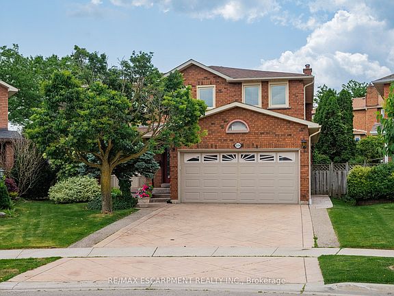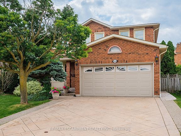 Exceptional Pie-Shaped Lot - Over 90 Feet Wide! Steps to Credit Valley Hospital. Nestled on a tranquil cul-de-sac, this charming Greenpark Homes - Mark 3 Model offers an expansive pie-shaped lot, stretching over 90 feet across the backyard, providing unparalleled space and seclusion. The meticulously landscaped front yard, adorned with mature trees and climbing greenery, guides you to a stamped concrete driveway and a welcoming covered porch illuminated by classic lantern-style lights. Upon entering, a bright foyer featuring slate-tiled flooring and wainscoting leads to formal living and dining areas, setting the tone for the home's refined aesthetic. The open-concept layout boasts hardwood floors, a bay window, and French doors, creating an inviting space ideal for entertaining. The chef-inspired kitchen is equipped with granite countertops, Shaker-style cabinetry, premium appliances, and a wine fridge, complemented by a sunny breakfast nook with bay and picture windows. The cozy living room, centred around a gas fireplace, offers a sliding door walk-out to the private, fully fenced backyard. The expansive backyard serves as a private retreat, featuring a stamped concrete patio, natural stone walkway, and a hot tub under a cabana-style frame. A professionally installed sprinkler system ensures the front and back yards remain lush and well-watered, enhancing the home's curb appeal and reducing maintenance efforts. Upstairs, four generously sized bedrooms with ample closet space and plush carpeting await. The primary suite is a serene haven, complete with a well-appointed 5-piece ensuite. The unfinished basement presents endless potential, offering space for a workshop, recreational area, and wine racks. Additional features include a two-car garage with interior access. This delightful home offers a rare combination of charm, livability, and space in a peaceful, well-established neighbourhood.