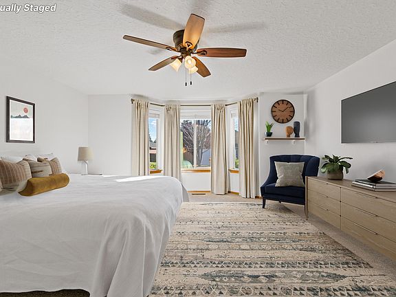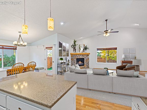 Spacious and well cared for! This single level, open floor plan with exterior log & stone accents features real hardwood wood floors in entry, kitchen and dining area. New carpet, LVP flooring, and tile in the bathrooms and laundry room were updated in the last year. Beautiful open kitchen with island, quartz counter tops, glass tiled backsplash, pendant lights, newer appliances, cabinet & drawer pulls. Great room w/ vaulted ceilings and gas fireplace. Built-in dining area updated with benches & wall shelves. Spacious master suite with bay window, double sinks & walk-in closet. Gas furnace, water heater & central A/C. Fully fenced yard with sprinklers on timers and a covered patio. Shed included. 2-car garage with custom built-in shelving for storage. Quiet neighborhood on a residential street, close to shopping and walking paths.