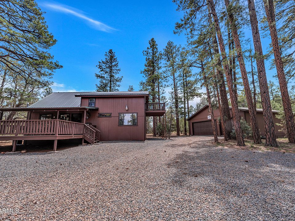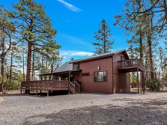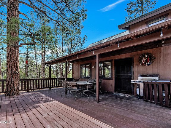 Tucked away in the peaceful pine forest of Section 31, this private 3-bedroom, 2-bathroom cabin offers the perfect escape from it all. Set on a generous 2.5-acre lot with towering pines and no through traffic, you'll enjoy the quiet solitude of mountain living with all the comforts of home. Step inside to find a warm, inviting layout with two bedrooms & a full bath on the main level, plus a spacious loft-style third bedroom upstairs—perfect for guests or a cozy bunk room. The large front porch invites you to sit back, relax, and take in the crisp mountain air. A standout feature of this property is the massive 30x40 detached garage - fully finished & currently outfitted with a projector, pool table, & workshop area. Whether you're storing toys & vehicles or creating the ultimate hangout.. ...space, the possibilities are endless. The home is being sold furnished and is ready to enjoy the second you arrive!