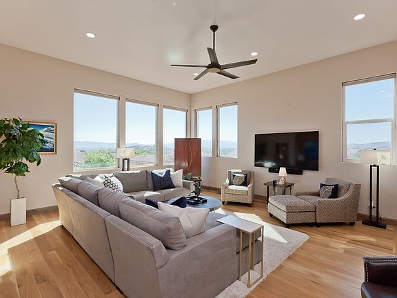 This custom home built by Griffin Concepts in 2019 is beautifully finished with custom cabinetry throughout, quartzite countertops with tile backsplash in kitchen, and quartzite counters in bathrooms, solid wood doors, 6" white oak flooring, and amazing large windows to allow abundant natural lighting in and provide views in all directions. Three bedrooms plus a spacious office, three bathrooms, two car garage with adjoining exercise room or shop. The walk in pantry is huge, has a wine cooler, and provides abundant storage to keep the kitchen uncluttered. Phenomenal, spacious master suite with custom closet and walk in shower. The home has been freshly painted and landscaping updated with a complete drip system. Enjoy the amazing views of the monument from your covered patio. This is truly a unique property that has it all.