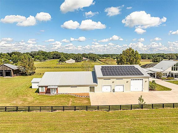 Welcome to your private retreat in the heart of Oxford, FL! This incredible 7.8-acre property offers a rare blend of luxury, versatility, and space, featuring not one, but three distinct residences along with a resort-style pool and expansive barn facilities. The centerpiece is a stunning two-story pool home (2,562 sqft) with 3 bedrooms and 3.5 bathrooms, combining comfort and luxury with hardwood and ceramic tile flooring, soaring ceilings, and a dramatic stacked stone gas fireplace stretching floor-to-ceiling, flanked by custom built-ins perfect for décor and display. The open kitchen is a chef’s delight with custom wood cabinetry, granite countertops, stainless steel appliances, large island with breakfast bar, farm sink with a picture window overlooking the front yard, and tile backsplash. Opposite the kitchen sits the spacious living room overlooking the majestic screened pool area, inviting the outdoors inside. Just off the main living space, a convenient office nook sits beneath the staircase, while a pool half bath is located off the laundry room for easy outdoor access. Upstairs, a loft-style landing provides flexible living space — ideal as an office, game area, or second lounge — overlooking the main level below. Each bedroom (downstairs) boasts its own ensuite bath with walk-in closets, while the master suite impresses with dual custom closets and a spa-like bathroom featuring dual vanities, a sit-down makeup vanity, an oversized walk-in shower with dual shower heads and rain shower, and a garden tub. Outdoor living is second to none with an expansive screened pool and spa area featuring a hot tub, built-in slide, mounted basketball goal, and an outdoor kitchen complete with stainless steel grill, ice maker, sink, and granite countertops — perfect for entertaining family and friends year-round. The second residence combines a 6,000 sqft barn with solar panels and includes 2,520 sqft of beautifully finished living space with open-concept design, exposed beams, full kitchen, and modern finishes, while the remaining 3,480 sqft provides incredible storage and workshop space for vehicles, RVs (14x14 garage door), boats, tractors, equipment, and much more. The third residence (manufactured home) is a fully independent dwelling featuring a comfortable open layout with spacious living area, well-appointed kitchen, and multiple bedrooms. It’s ideal as a guest home, caretaker’s quarters, or potential income-producing rental. Lastly, an additional open barn wrapped in cedar provides space for hay, tractors, and mowers, while the 7.8 acres are perfectly suited for cows, horses, gardening, or hobby farming. With no HOA and no deed restrictions, this property offers unmatched flexibility and freedom of use. Conveniently located just minutes from The Villages®, shopping, dining, and major highways, this one-of-a-kind estate delivers the perfect balance of country living, luxury amenities, and versatile potential.