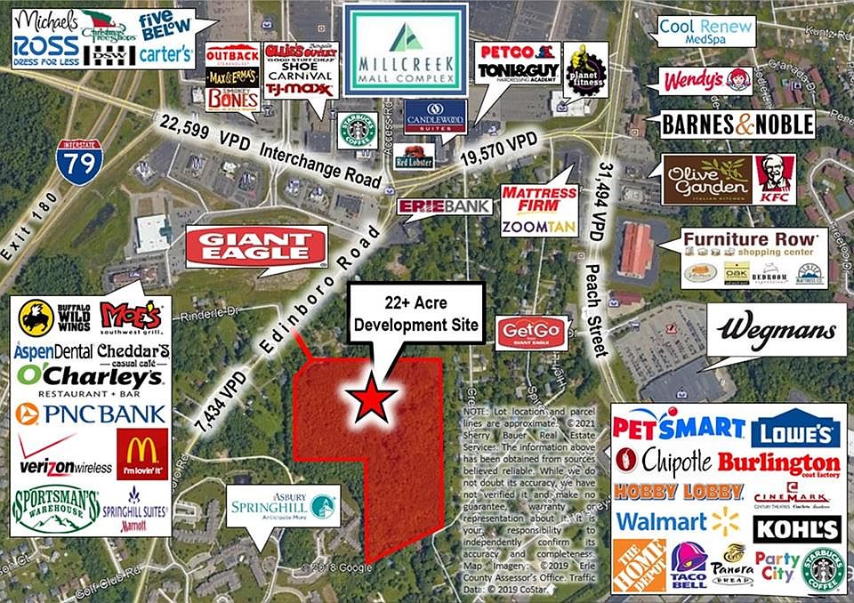 22 ± Acre multi-family development site in the heart of Greater Erie's major retail corridor now available for sale. Zoned R-4, High Density Residential in Millcreek Township. Located next to Springhill Senior Living, across from Millcreek Marketplace & just 1/2 mile from I-79 at Exit 180. Public utilities available. Assemblage of 3 sub-divided parcels: 33-187-584.0-008.00, -010.00 & 33-188-584.0-013.00. May sub-divide. Offered at $75,000/Acre & ready for development.