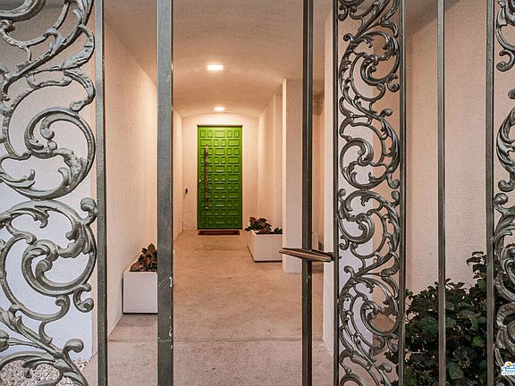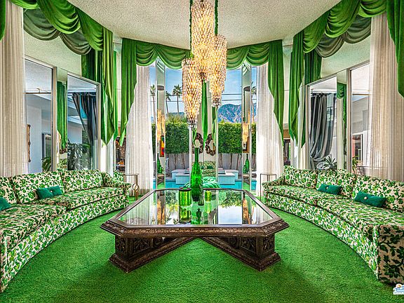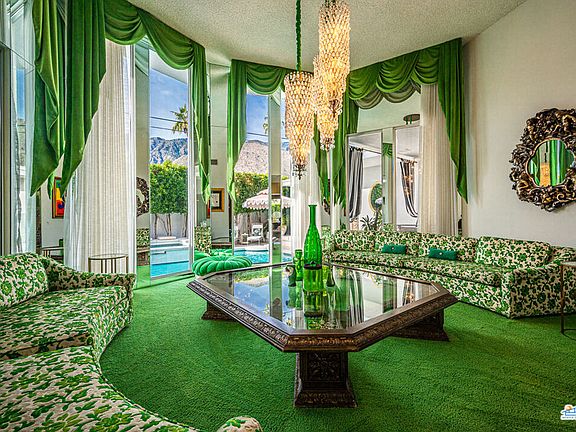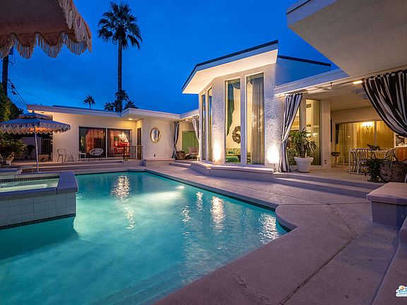 This iconic mid-century time capsule has been meticulously preserved and updated in all the right places. The entertainers dream Updates to this 3 bed 3 bath home include owned solar system, complete kitchen renovation, new double pane Fleetwood sliders and windows throughout, 2 A/C systems, reupholstered dining chairs, drapes, updated pool and spa, renovated garage and much more. This home has been published many times over by large fashion brands, jewelry companies, major celebrity musical acts, lifestyle, film and television projects. Not only does this have an outstanding background for production income but for vacation rental as well. The renovated kitchen comes complete with new cabinetry, quartz counter tops, Moroccan tile floors, dual dishwashers and gourmet range. The large pink primary suite's new sliders open directly to the pool and includes 2 large walk-in closets just steps away from the poured terrazzo tub in the center of the primary bath. On the opposite side of the house you will find the private blue guest quarters with sliders that open to the pool complete with ensuite. Enjoy casual lounging in the den on the white shag carpet in front of the fireplace listening to the juke box while guests sip drinks at the bar, or step it up a notch to the formal green rotunda living room complete with floor to ceiling glass, breathtaking chandeliers and furnishings built for the room. Custom built original furnishings throughout. The newly installed electronic driveway gate, walk up gate and mature hedge allow for ultimate privacy and security. All of this nestled in the well known south Palm Springs neighborhood of Twin Palms.