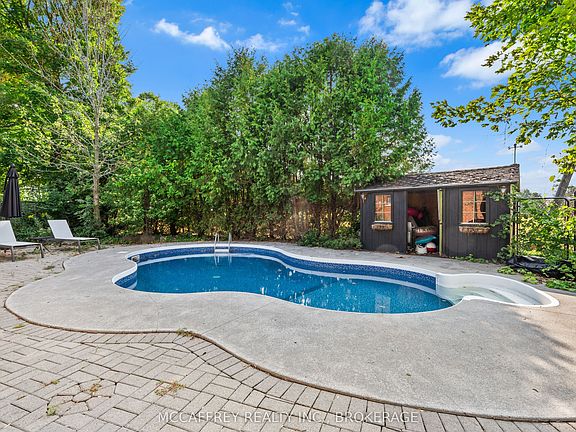 Welcome to this lovely all-brick bungalow, boasting an impressive renovation and offering an attached one-car garage, situated on more than an acre of beautiful country landscape. Fully refurbished to outstanding standards, this home invites you to enjoy immediate occupancy and indulge in the grace and charm of countryside living. Step onto the newly installed deck and into a home that bears testimony to high-quality craftsmanship in every nook and corner. At the heart of the home is a well-lit eat-in kitchen, showcasing an impressive waterfall island and ample cupboard space. Adjacent to the kitchen lies a spacious separate dining room featuring large windows that fill the area with blue sky and natural light. The large Primary bedroom serves as a private haven, complete with a three-piece ensuite and a generous closet. An additional bedroom and a four-piece bathroom complete the array of rooms on the main floor. A descent to the fully finished walk-up basement reveals a cozy rec room with a woodstove, a practical utility room offering an abundance of storage space and easy garage access, as well as two comfortably-sized bedrooms and an additional three-piece bathroom. Outside, bask in the serenity of the countryside under the gazebo, while enjoying long leisurely days in the inground saltwater pool. The abundant yard serves as the perfect space for social gatherings or quiet solitude. Inside and out, this home offers a cozy sanctuary underpinned by the tranquility of the idyllic country setting - a beautiful retreat for enjoyable living. Woodstove '24, Heat pump '23, Metal roof '24, Pool liner '22, Pool pump '24, Salt cell '25, Kitchen '23, and so much more!