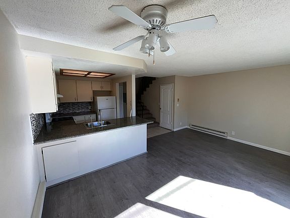 The unit has an updated kitchen, wood flooring downstairs, and new carpeting upstairs.