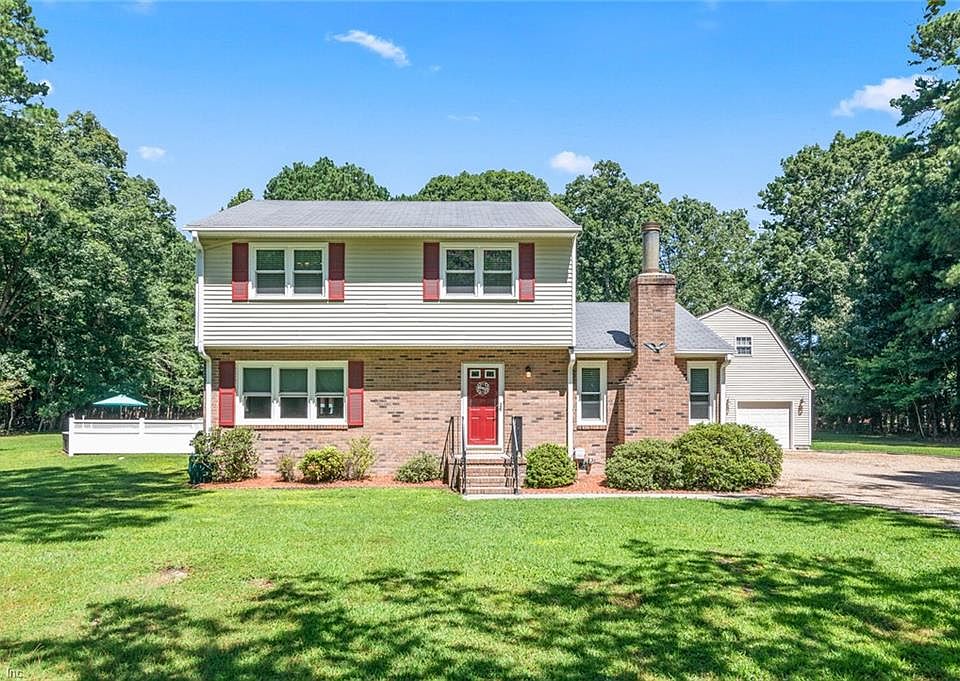 Lovely 2-story traditional home tucked away on 2.9 acres uniquely offering the serenity of country living and the convenience of area shopping, restaurants and activities. This well-maintained 4-bedroom, 2-bath home offers hardwood floors throughout and features open interior spaces with French doors connecting the living room, kitchen and charming eating area, as well as a mud room/laundry room and renovated bathroom. Get cozy in the den by the fireplace or relax in the large 3-seasons sunroom overlooking the inground pool. Connect with nature outside on the back deck or work on projects in the 2-story barn. The detached 2-car garage includes a second-story bonus room. Minutes from Historic Smithfield, Suffolk, and the James River Bridge.