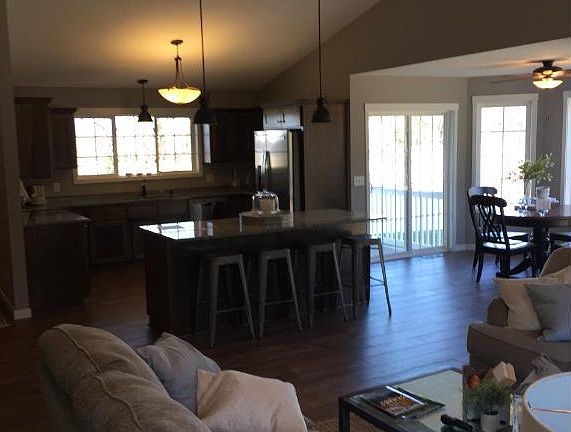 Beautiful country Rambler. Large wrap around covered porch. Lot has trees lining 2 sides. Quiet well kept neighborhood. all maintenance free exterior. Look out windows in basement for plenty of light. Hardwood floors in the kitchen, living room and dining room. Gorgeous master bath with ceramic floor and ceramic shower. Beautiful gas burning fireplace in living room with custom designed cedar log mantle. Main floor Laundry room/mud room with jacket closest as well as a custom made bench