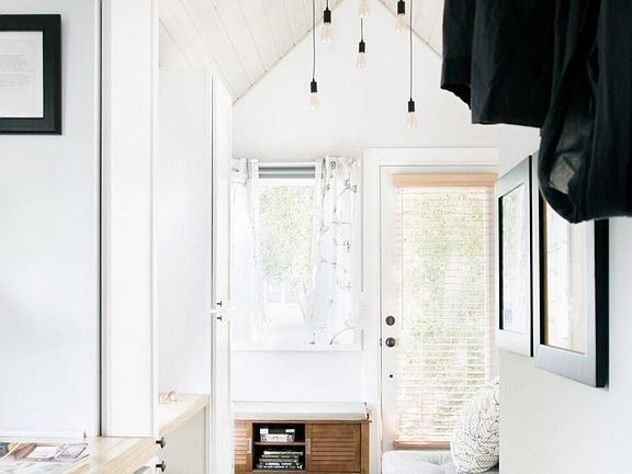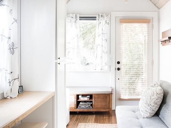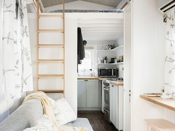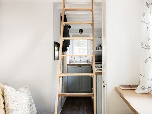 It's tiny! But it doesn't feel that way. Light colors, high ceilings, and lots of windows help open it up and create awesome vibes. The loft holds a queen-sized mattress, which sits low to the floor on tatami mats. There is a full bath with a rain-down shower, air vent, and cloth curtain door. There is a fully functional kitchen, with gas stove and microwave. There is a desk/table, comfy futon couch, ottoman, and cabinet storage.