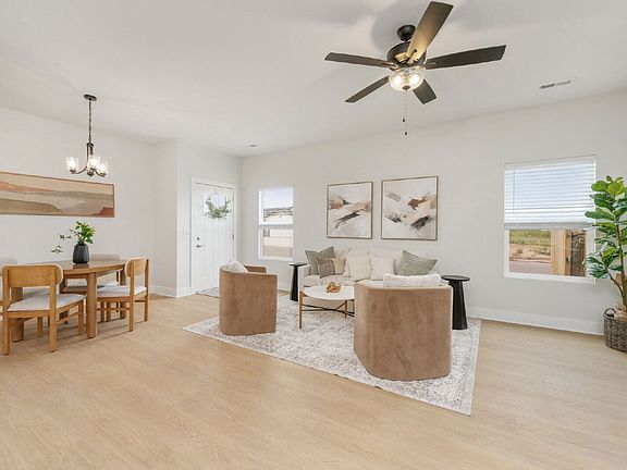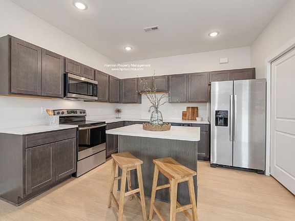 These zero-entry ground-floor-only townhomes feature luxury vinyl planking in the kitchen, living room, laundry room, and bathrooms, with carpet in the bedrooms. The kitchen features granite countertops, a walk-in pantry, and all-new stainless-steel appliances, including a refrigerator, stove, dishwasher, and microwave. There is a separate laundry room with hookups for a washer and dryer. A full bathroom is located off the hallway. The main bedroom features a walk-in closet, a full en-suite bathroom with an easy-access walk-in shower, and a sliding patio door that opens onto a fenced, concrete patio area. A combination of rough iron and wood privacy-fenced yard with new grass and sprinkler system. Access to the community clubhouse, which will include a pickleball court, pool, and playground, is expected to be available in late 2025 or early 2026.