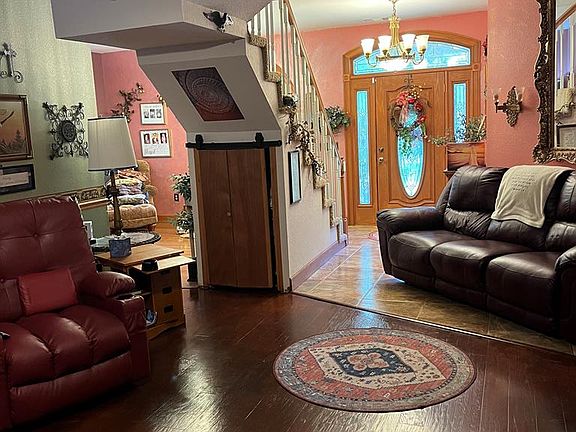 Brick homeStone fireplaceCustom-made inground poolCreek bridgeWood-burning stoveLush landscapingDining room