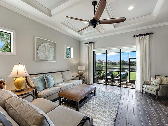 Enter this stunning 3BR+DEN home and you are immediately welcomed by a bright, open floorplan with lake view surrounded by lush landscaping. This beautifully decorated and sophisticated interior offers a gourmet kitchen complete with built-in KitchenAid appliances, walk-in pantry, butler pantry area quartz countertops, raised coffered ceilings, recessed lighting, crown molding, smooth texture walls and plank tile flooring throughout, 4' garage extension, plantation shutters, pocket patio slider and den/office French doors. The spacious owner suite includes walk-in closet with built-in cabinetry, separate shower, oversized bathtub, dual sinks and a walkout door to the screened patio. The guest bath accommodates two adjacent bedrooms with a step-in shower and frameless glass door. You'll even enjoy doing laundry in this well appointed space with custom cabinetry and ample storage. Corkscrew Shores is a gated, lakefront resort-style community that spans over 700 acres and is surrounded by preserves and a 240-acre lake and features a spectacular amenity center, a full-service restaurant and bar. Residents enjoy activities, entertainment, events and sports including pickleball, tennis, bocce, state of the art fitness center, movement studio, shaded children's play area, walking trails, kayak/canoe launch, and fishing pier. Conveniently located between Naples & Fort Myers just minutes to popular dining, shopping, golfing, beaches and airport. Estero is a hidden gem and one of the fastest growing cities in Southwest Florida!