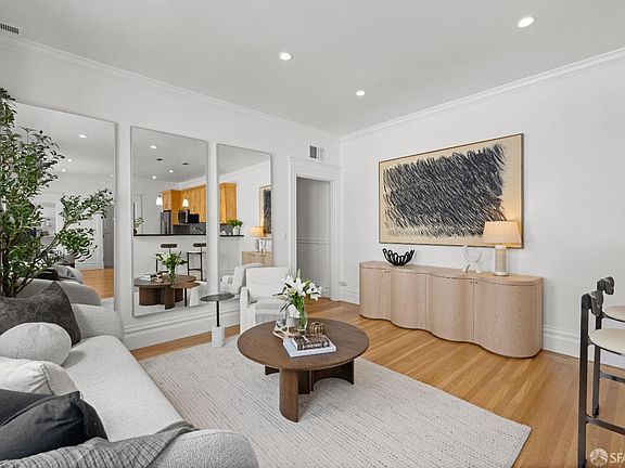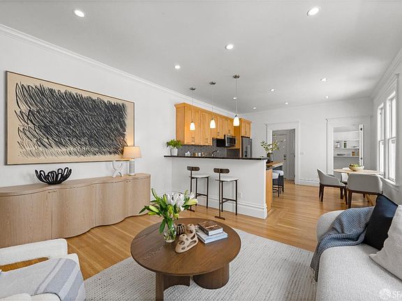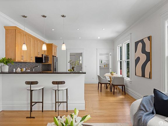 Timeless San Francisco charm meets modern sophistication in this beautifully reimagined Edwardian residence. Thoughtfully designed for both comfort and style, the flexible floor plan offers three generously sized bedrooms and an open-concept living space enhanced by rich hardwood floors, soaring ceilings, and expansive windows that flood the home with natural light. The chef's kitchen is both functional and elegant, featuring granite countertops, a designer tile backsplash, premium stainless steel appliances, and a professional-grade Wolf range, ideal for daily living or effortless entertaining. Additional amenities include recessed lighting, central heating, and in-unit laundry. This residence also boasts a rare, oversized side-by-side garage parking spaceoffering ample room not only for vehicles, but also for bicycles and additional storage. Beyond the generous in-unit closet space, a spacious, dedicated storage locker on the ground level adds an extra layer of convenience. A shared backyard with artificial turf and lounge seating provides a sunny urban retreat. Perfectly positioned at the crossroads of Mission Dolores, Dolores Heights, and Duboce Triangle, seamless access to parks, cafes, shops, and commuter routes delivering the quintessential San Francisco experience.