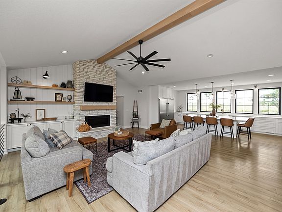 Experience the perfect blend of luxury and country living with this incredible acreage just outside of Madrid. Built in 2020 by Ridgewood Homes, this residence offers over 5,200 sq ft of living space, 6 bedrooms, and 7.64 acres. The main living areas feature an open floor plan. The living room has vaulted ceilings, a floor-to-ceiling fireplace, and windows that line both sides of the home. The kitchen is a dream, with a large island, quartz countertops, dual gas stove, and walk-in pantry. A large mudroom/drop zone leads to the laundry room and an additional room with sink and folding space. The primary suite overlooks the backyard and features dual sinks, a tile shower, and walk-in closet. Two bedrooms are located on the main level, along with a full bathroom and a half bathroom. The finished lower level boasts 9 ft ceilings, in-floor heat, an additional living room, rec room, workout room, wet bar with full fridge, 3 bedrooms, a full bathroom, and a half bathroom. Outside you’ll find an oversized attached 2-car garage, patio, front porch, and a large yard. This property also includes three impressive shops: the first (approx. 60’ x 30’) with furnace and AC, the second with in-floor heat and three overhead doors, and the third with in-floor heat, three overhead doors, a bathroom, and office space. This one-of-a-kind property truly offers the space, amenities, and lifestyle you’ve been dreaming of.