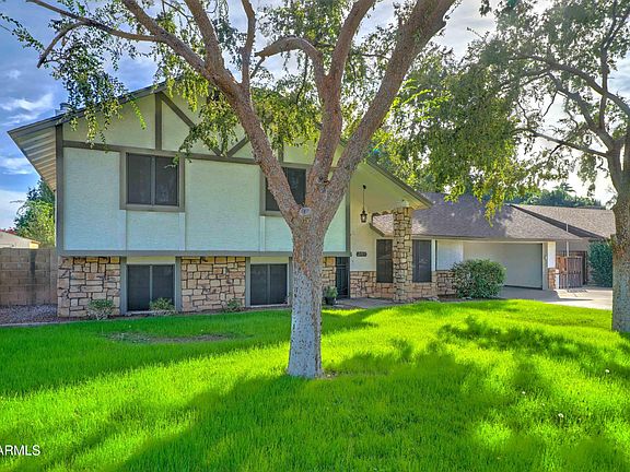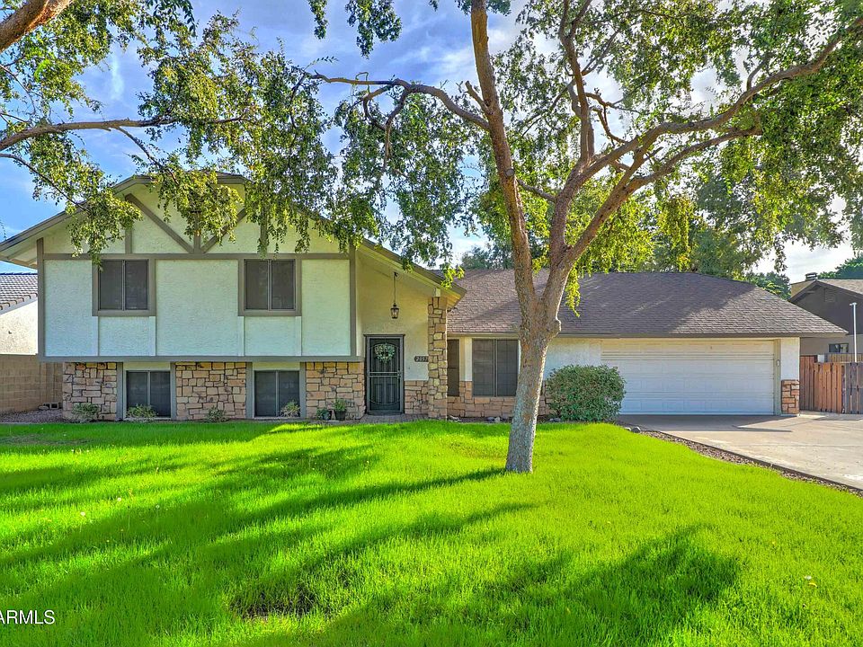 Beautifully maintained tri-level home on an oversized lot in the highly desirable 85213 area! This spacious residence offers 5 bedrooms + bonus room, 3 full baths, and approximately 2,064 sq ft of flexible living space. The main level features vaulted ceilings, large picture windows, and an open kitchen with breakfast area. The upstairs primary suite has a private balcony, dual closets, an updated bath, along with two additional bedrooms and a full hall bath. The lower level includes a cozy family room with fireplace, two bedrooms, and a full bath—perfect for guests or multi-gen living.
