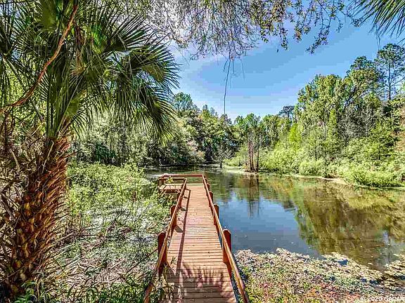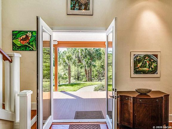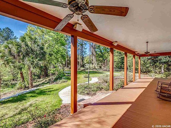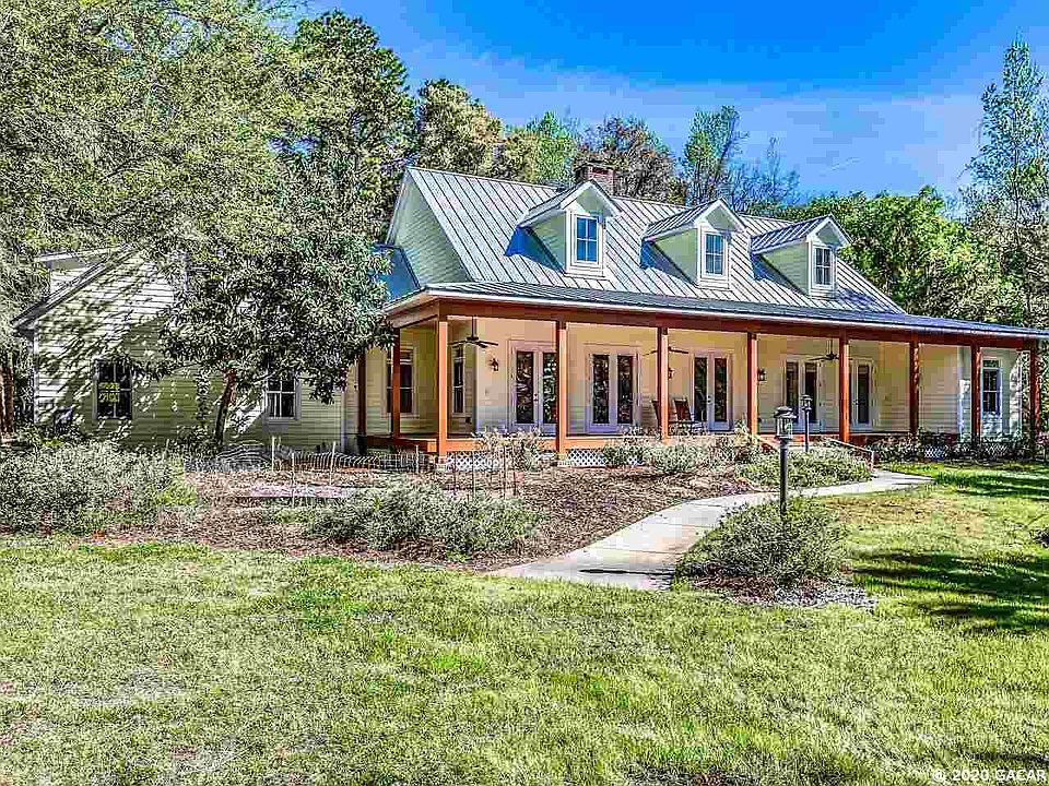 Stunning Stewart Smith custom built home on 3 acres. This beautiful 5BR/4.5BA concrete block features an elevated cooking hearth wood fireplace in the living room, engineered hardwood floors throughout. The kitchen features a Wolf gas range, electric oven, commercial hood, quartz kitchen counters, Fridge/DW - 1 yr. new. Large dining area. One bedroom and large master on the first floor. Office off of Master. Master opens to the front porch and looks onto the pond, the master bathroom features a garden tub, vanity area, walk-in shower, with two private toilets. 2nd floor - gym (bedroom), small bedroom- plumbed for bathroom and 3rd and 4th bedroom. Iceliing foam insulation. 3 car garage, with apartment above. Detached over sized 4 car garage for Cars, Boats, RV. Lenox AC - 10 yrs. new, 2 tankless propane HW heaters, 1000 gallon propane tank buried in backyard, 2/3 of pond on property conveys stocked with Bass & Bream. 240 1 horsepower circulator. 7000 watt generator, generator pad outside, Minutes to UF, Shands and Nationwide. Enjoy nature from any window, deer, turkey. Private, gated & fenced.