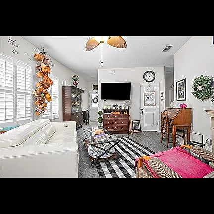 Convenient, Convenient, Convenient This charming 3 bedroom, 2 bath home is nestled in a quiet subdivision with community pool.close to Hospital, Doctors offices, schools and downtown Deland. Has a screened in back porch with a beautiful garden in backyard. Solar paid in full. Average electric bill $33. Inside, discover Bedrooms with lush carpet, kitchen and bath with slate floors and main area with waterproof vinyl flooring. Essential appliances stove, refrigerator, dish washer and a washer. You will enjoy the entrance to the master bedroom with a secret, Murphy style bookshelf door. 2nd bedroom has a beautiful country style Murphy bed professionally installed for guest. This house also has plantation shutters.
