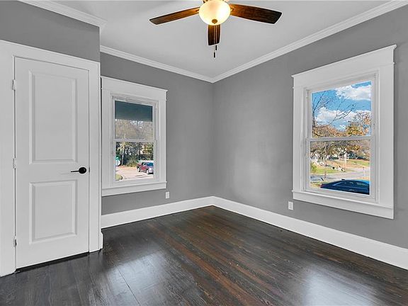 Welcome to this stunning beautifully renovated 3-bedroom, 2-bath bungalow where modern updates meet classic charm. Step inside to find rich dark hardwood floors, an open-concept main level, and stylish fixtures that give the home a fresh, designer feel. You’ll love the exterior color—this home truly pops from the street. The main level features brand-new cabinets, new stainless appliances, and granite countertops in a beautifully updated kitchen. The back sunroom adds a perfect flex space—ideal for morning coffee, a home office, or extra lounging. Head upstairs to the oversized bedroom that can function as a spacious primary suite with room for a nursery, complete with its own full bath. The bathroom showcases fun wallpaper, new vanities, new fixtures, and a new toilet—every detail thoughtfully chosen. This home is packed with upgrades: