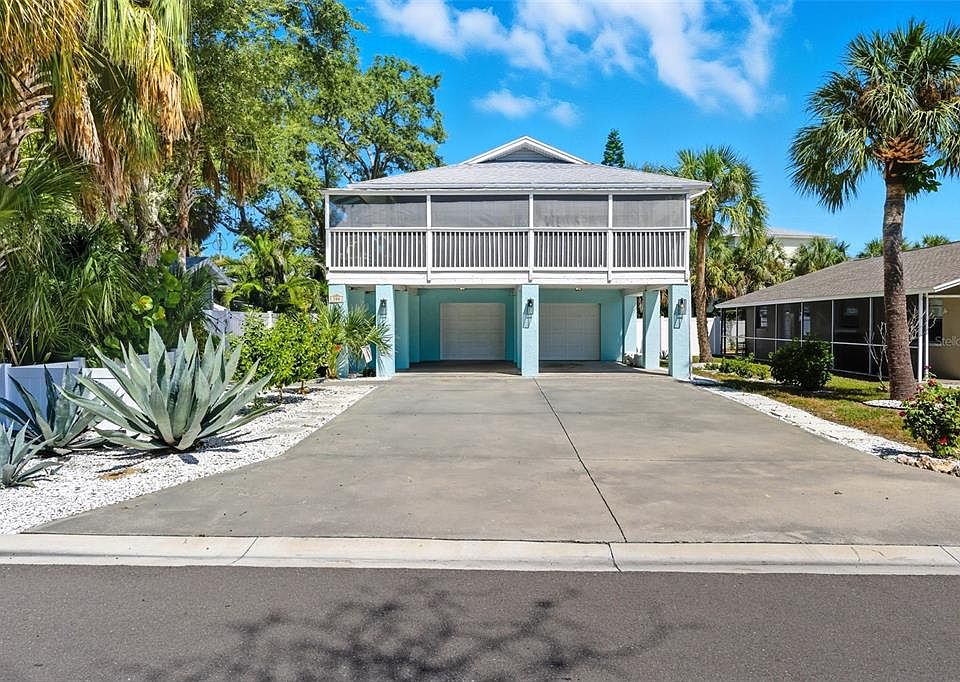 Relax on the rocks – coastal Key West charm near the beach! Welcome to this adorable coastal-eclectic Key West–style elevated home just two blocks from the beach. This fully furnished three-bedroom, two-bath retreat blends comfort, style and fun — ideal as a primary residence, vacation getaway or turnkey investment property with a strong rental history. Go inside to find bright, inviting interiors with updated stainless steel appliances, full-size washer and dryer, and plenty of space to unwind. Enjoy morning coffee or an afternoon nap in the hammock on your large screened front balcony or take in backyard views from the rear balcony overlooking a private oasis designed for entertaining. The oversized two-car garage plus two-car carport provide ample parking and storage. Outside, the backyard is a coastal playground featuring a cornhole setup, barbecue grill, fire pit with seating, outdoor Edison lighting, jacuzzi and ping pong table, ideal for making memories with family and friends. In a golf cart–friendly community close to shops, restaurants, pubs and live music, you’ll also have easy access to the Jolly Trolley for a carefree ride from Clearwater Beach to St. Pete Beach. Spend your days shelling, snorkeling, paddleboarding, fishing, boating, jet skiing or simply watching the breathtaking Florida sunsets.