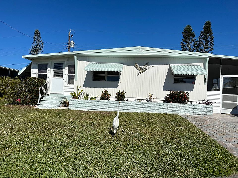 What a dollhouse! As soon as you step inside, you'll feel right at home. This sweet home has been lovingly maintained and is offered partially furnished. It is in move in condition and immaculate. All rooms are comfortable in size. The primary bedroom is king sized and the guest bedroom offers a private half bath. Plenty of seating in the living area for entertaining or visiting with additional living space in the Florida room. The oversized screened in lanai is bordered by privacy palms and is a perfect addition offering fresh air living space. AC is serviced twice yearly, roof was sealed 2025. And the bonus is the location, here in our Lake Village where you can indulge in the vibrant community amenities, including a Clubhouse with Banquet Facilities & Billiards, a Game Room/Library. Two Tiki Lounge areas with Grills available. Fitness Center, Bocce Ball, Putt-Putt Golf, Shuffleboard, Horseshoe Pits and our Community Garden, not to mention the many groups you can join, classes you can participate in and our everchanging events to attend! There is additional storage area available (for a nominal monthly fee) so bring all of your toys with you! Boats, RVs, all of it! We also have on-site laundry facilities available. We are a 55+, pet-friendly (with some restrictions/limitations), motorcycle community. Land lease amount is a recurring monthly and includes sewer, water, lawn maintenance, trash pick-up, tax pass-on & use above amenities!. Just 2 miles to the Beach! This sweet spot is nestled between Sarasota and Venice. Access to the Legacy Bike Trail is in very close proximity to the park. Incredible shopping whether boutique or big name stores you'll find them all close by. Dining options are only limited by your imagination. From comedy clubs to the opera house, aquariums to botanical gardens to museums...it's all right here! Truly a wonderful place to call home! Agent owned