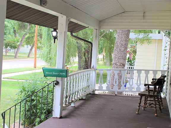 This is a historical neighborhood in Minot. If you like history, charm and front porches...this is for you!  Lovely original woodwork throughout along with a stained glass window brings some of the charm of that era.  You will first walk up to a wonderful, welcoming front porch and then enter into a very spacious living room, dining room (with fireplace, typical of era) and then into a nicely remodeled  good size kitchen with a eat-in nook, stainless steel appliances, super large pantry and off of that is a 1/2 bath and laundry room.  Leading to the upper level from the living room is a beautiful high quality wood staircase.  Once upstairs you will find 2 large bedrooms, both with large closets along with hideaway storage closets, and a full bath.  From the kitchen you will enter onto a large deck, fenced back yard, then to the 2-car garage (ceiling insulated).  You will enjoy the raspberry bushes in the summer.  The basement has great potential for another bedroom and recreation room.  The high efficiency furnace , water heater and water softener are also located in the basement.  The roof is 5 years old.  The owner never used the fireplace, so it would need to be inspected prior to using.