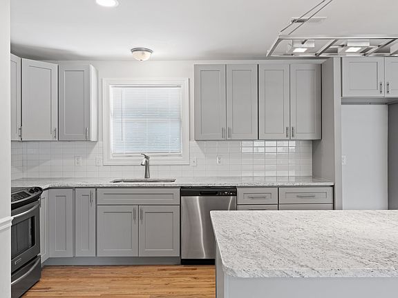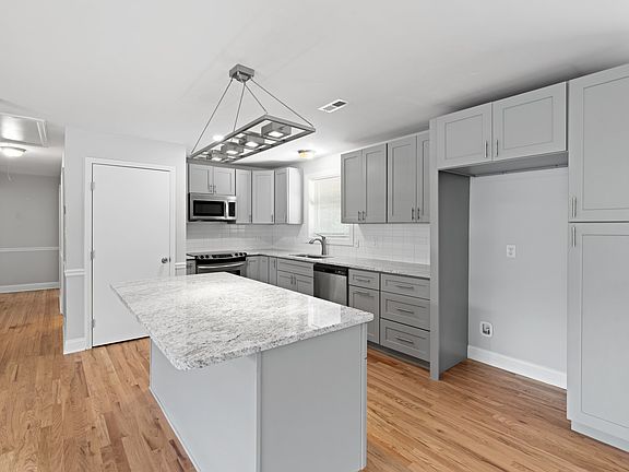 - Designer-renovated kitchen with soft-close gray cabinetry, granite counters, subway tile backsplash, island seating, and stainless-steel appliances (brand new refrigerator!)