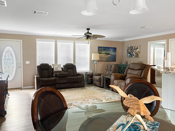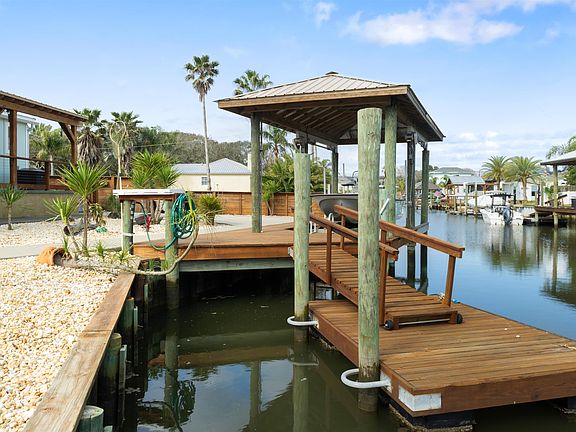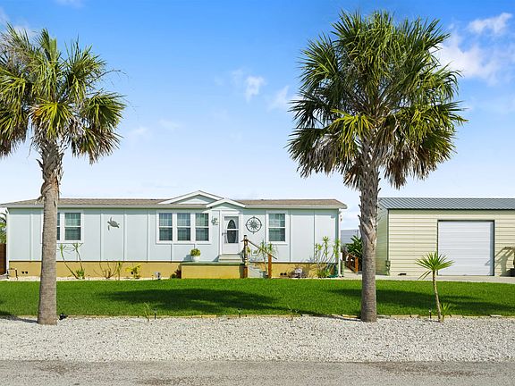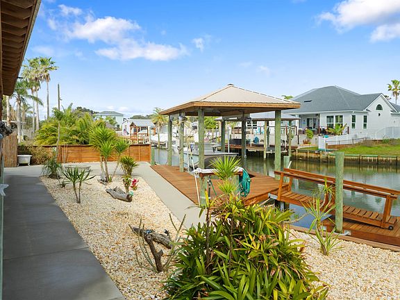 Tropical Fisherman's Paradise on Canal with direct access to the Intracoastal Waterway complete with boathouse and 6000lb boat lift, lighting, electric outlets, floating dock, fish cleaning table and fresh water. Modular home features 3bed/2bath split floor plan with open concept in the living area. Washer, Dryer along with Kitchen appliances and new Stainless dishwasher are included. Concrete stem wall and concrete foundation under modular, upgraded Hardie Board siding. Concrete Walk Ramp with stem wall, hand railings and stainless steel railings for easy access to 12X56 Custom Contractor Built Porch that looks over the waterway, to enjoy the outdoor living. The property is beautifully landscaped with river rock surrounding tropical plants, concrete slab for a boat trailer, outdoor Surfboard shower, and large fire pit area. Bonus 20X29 Carolina Carport is a must see with 10X10 pull down bay door and walk thru side door. It is insulated, air conditioned with work shop area and workshop cabinets. There is an engineered Contractor Built Mezzanine with 250 lb Versalift Elevator for storage capability. This outdoor building has concrete footers around the perimeter with 5"-6" slab which allows the ability to install a car lift if desired. It also includes a 10X12 Permitted/Anchored shed with steep ramp for easy access. Includes an ice machine for entertaining or loading up your coolers! These sellers have meticulously maintained and thought of everything including front yard St. Augustine Sod, rainbird Sprinkler, timer, sensor and separate garden area with drip line watering system. No HOA in this subdivision. Make this Waterfront Paradise your new home or successful income producing vacation property.